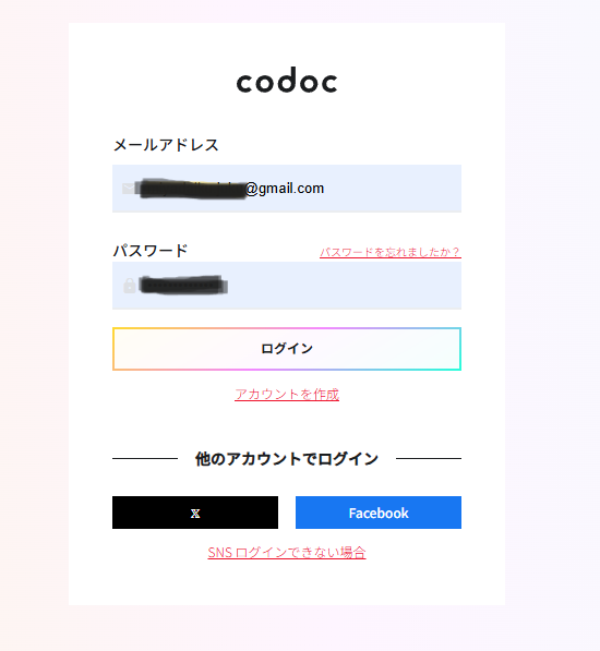 codocのログイン画面が表示されたら、メールアドレス・パスワードを入力しログインをクリック